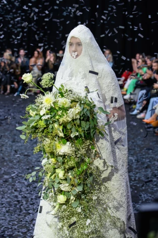 Завершилось дефиле белым свадебным нарядом в виде кокона, напоминавшим одновременно и туго спеленутого младенца, и саван мертвеца, — жизнь и смерть в одном “флаконе”.