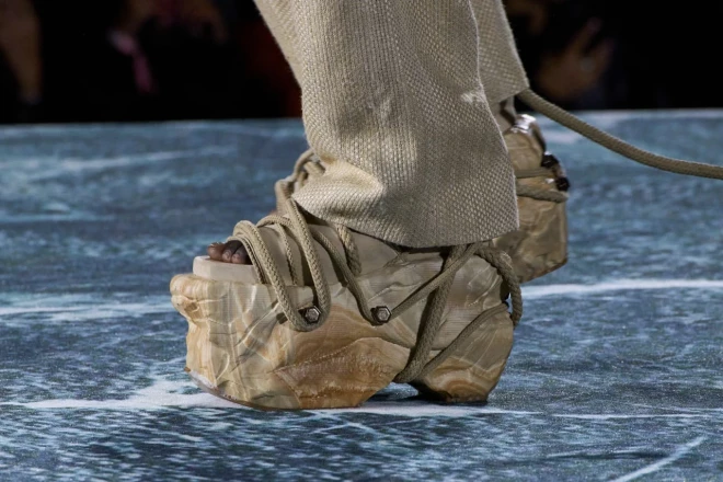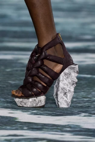 Босоножки с каблуками-булыжниками и туфли в виде кусков камня, перемотанных веревкой, смотрелись максимально сюрреалистично, а за носивших их моделей было реально страшно.