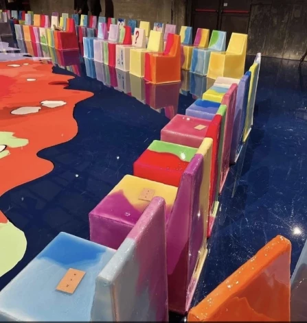 Демонстрация технологий продолжилась и в декоре пространства: пол и 400 стульев на показе Bottega Veneta были залиты разноцветной эпиксидной смолой.