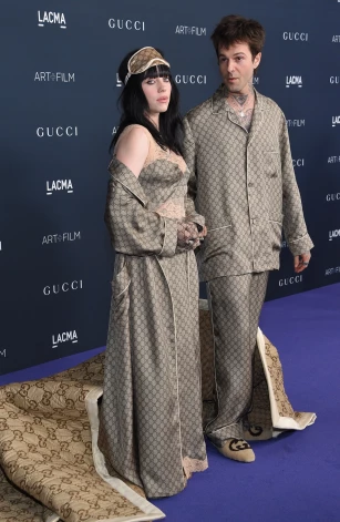 На красную дорожку пара вышла, закутавшись в большое одеяло от Gucci. Распахнув его, влюбленные продемонстрировали пижамообразные костюмы с тем же рисунком в виде фирменной монограммы бренда. Главным аксессуаром у Билли стала маска для сна (тоже, естественно, от Gucci).