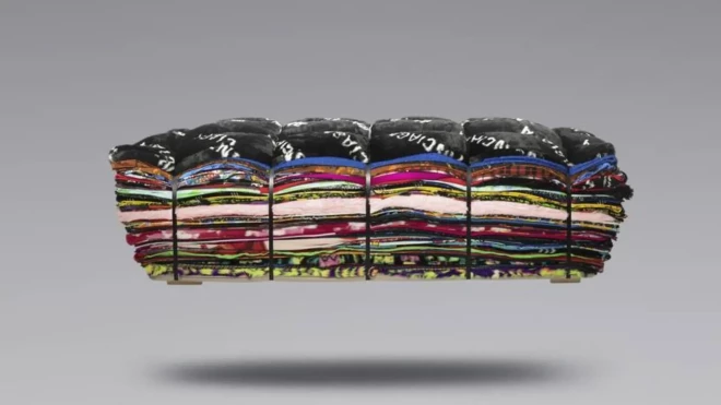 Удивительный предмет мебели под названием “Droog Rag Bench” (“Тряпичная скамейка от Droog”) был создан по заказу Balenciaga голландским дизайнером Тейо Реми. Его фирменным стилем является нестандартное вторичное использование бывших в употреблении материалов.