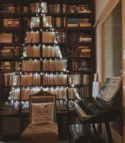 Греческая блогерша #BreathingPages лишь обозначила контуры елки в своей библиотеке при помощи гирлянд фонариков.