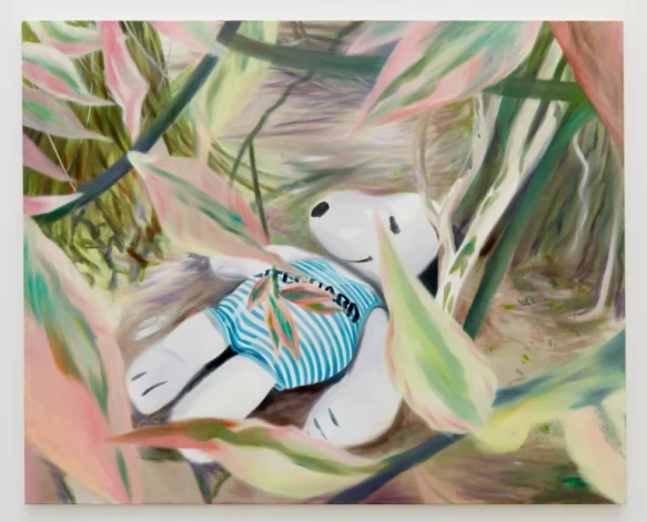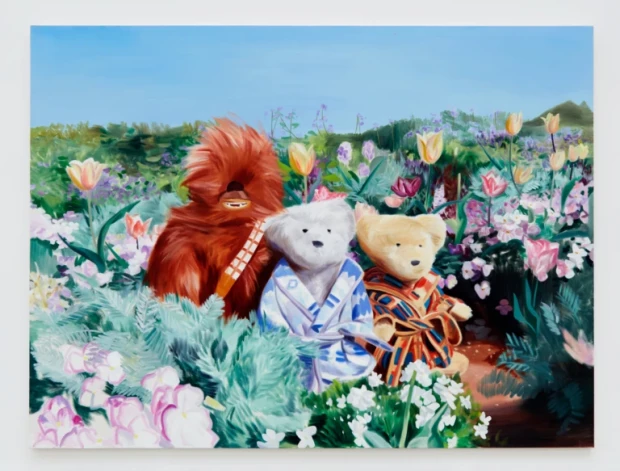 Современная японская художница сочетает обычные бытовые сюжеты с персонажами поп-культуры. В этом году ее большая выставка прошла в галерее Karma, Нью-Йорк.