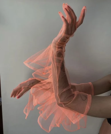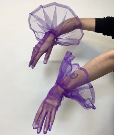 Британская марка T Label, основанная дизайнером Тейлор-Беа Гордон, как раз и специализируется на перчатках. Самая ходовая модель бренда - из прозрачного шифона с оборками.