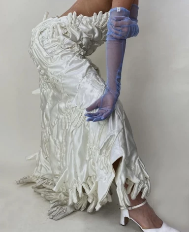 А недавно T Label представил свадебное платье Jolie, изготовленное из 78 белых атласных перчаток.