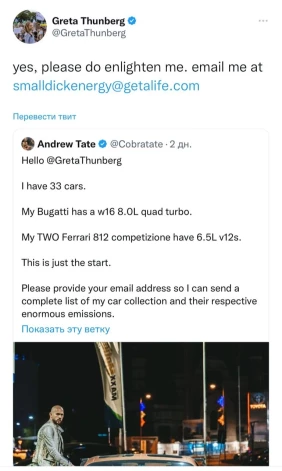 Сммщик, ведущий социальные сети Греты, согласился и выслал ему электронный адрес, в котором был издевательски зашифрован намек на небольшой размер полового органа шутника, - smaldickenergy@gatalife.com. Публика, следившая за этой перепалкой, пришла в восторг: твит получил 3.1 миллиона лайков.