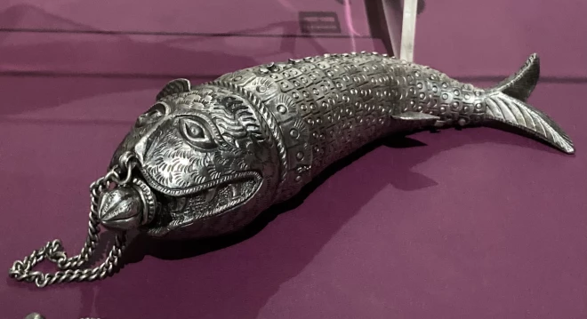 Например, изящные серебрянные рыбки, которые на первый взгляд кажутся сугубо декоративными предметами, на самом деле являются емкостями для хранения косметики и благовоний. В 19 веке индийские женщины хранили в них краску для век и губ, а также куркуму и розовый порошок для ритуальных подношений в домашних алтарях.