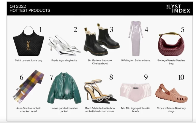 Платформа по поиску модных товаров Lyst ежеквартально публикует список самых популярных товаров в мире моды. При составлении этого рейтинга оцениваются 6 миллионов предметов по упоминаниям в социальных сетях, поисковым запросам, просмотрам страниц, взаимодействиям и продажам в тысячах онлайн-магазинов. Вот как выглядит новый ТОП 10 самых модных вещей и брендов по итогам 4 квартала 2022 года.