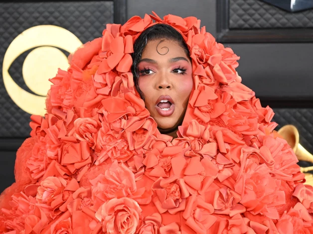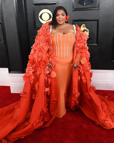 Обладательница награды в категории “Запись года”, рэперша Лиззо вышла на красную дорожку в оранжевой охапке роз от Dolce b Gabbana, скинув которую, осталась в сексапильном корсетном платье.