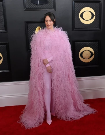 Кантри-певица Кейси Масгрейвс была невероятно эффектна в бледно-розовом кэтсьюте c перьевой накидкой от Valentino.