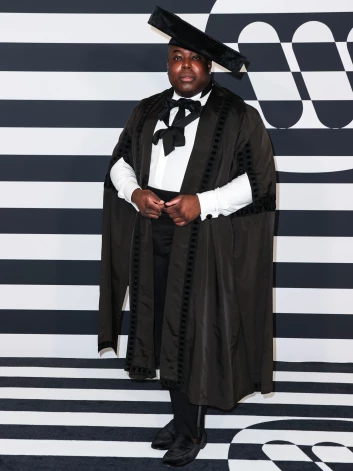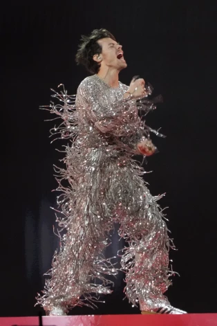 Британский певец Гарри Стайлз на красной дорожке появился в расшитом разноцветными пайетками костюме Арлекина.