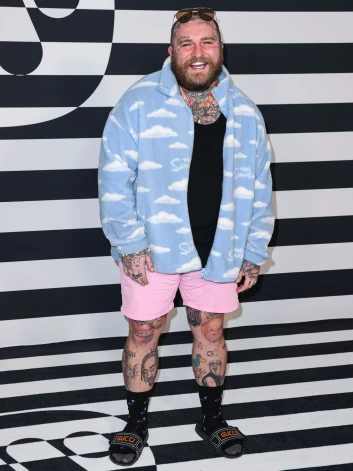 А автор и исполнитель Тедди Свимс - в курортно-дачный наряд с розовыми шортиками и тапками с носками.