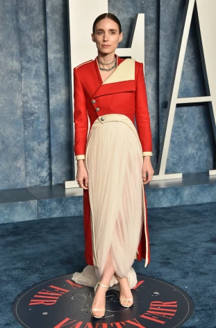 Начнем с того, что, видимо, далеко не все гости оказались в курсе того, что дорожка на сей раз будет не красная, а бежевая (точнее, цвета шампанского). Соответственно, все бежевые, серые и белые наряды на ней смотрелись блекло, а некоторые с ней попросту сливались. Впрочем, гости фотографировались не только на бежевом фоне, но и на синем - сразу после официальной церемонии началась традиционная вечеринка Vanity Fair, где гости, как правило, одеты смелее и интереснее, чем на основном мероприятии (многие успевают переодеться).