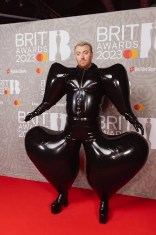 Потом британский поп-певец Сэм Смит вышел на красную дорожку церемонии BRIT Awards в смешном латексом костюме.