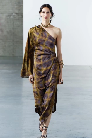 Длинные и свободно ниспадающие платья с асимметричным решением верха, кокетливо обнажающим одно плечо, подойдут для любой жизненной ситуации. Днем в городе его можно сочетать с босоножками - подойдут как нежные, так и массивные формы, а надетые на вечеринку туфли на каблуке сделают образ более шикарным.