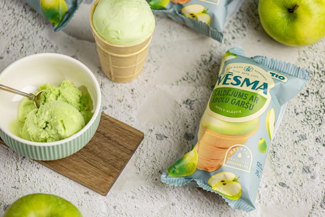 Вслед за растущим спросом покупателей на более легкое по питательной ценности мороженое линия Vēsma в вафельном стаканчике пополнилась одним новым продуктом. Теперь это уникальное мороженое из сырной сыворотки доступно и с освежающим вкусом зеленого яблока.