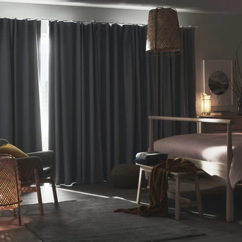 - И, наконец, блокирующие гардины идеально подходят для спальни, поскольку они блокируют свет и полностью затемняют комнату (например, блокирующие шторы BENGTA за 15 евро). С этими гардинами лунный свет и уличные фонари не будут мешать спать, а солнце не разбудит вас, если вы захотите поспать подольше. Гардины-блокаут также подойдут для защиты от сквозняков зимой и жары летом. Более того – плотные гардины-блокаут помогают приглушить акустику помещения.