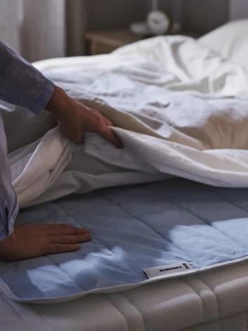 «Наматрасники или подкладка REXBEGONIA, всего за 8,99 EUR помогут дать ощущение прохлады. Вы также можете их охладить ещё больше, положив в специальный пакет и в морозилку, перед использованием. У некоторых эргономичных подушек, например SPETSHAGTORN за 12,99 EUR, есть специальная охлаждающая сторона»,– говорит дизайнер.