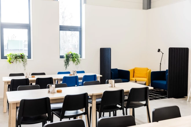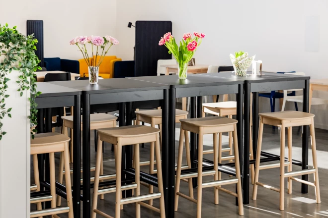 Поскольку столовая выполняет двойную функцию, была создана просторная зона, способная вместить до 30 человек. Столы типа барной стойки и табуреты стратегически расположены рядом со входом в помещение, что позволяет сотрудникам удобно делать перерывы и возвращаться к своей повседневной рутине. Для улучшения эстетики барные табуреты и столы из натуральной березы сочетаются с черными, создавая целостную атмосферу. Кроме того, было выбрано несколько стульев в синих и белых тонах, чтобы придать помещению яркий и современный вид. Столы имеют разные размеры, что позволяет сотрудникам гибко располагать их в соответствии со своими предпочтениями, обедая индивидуально или всей командой.