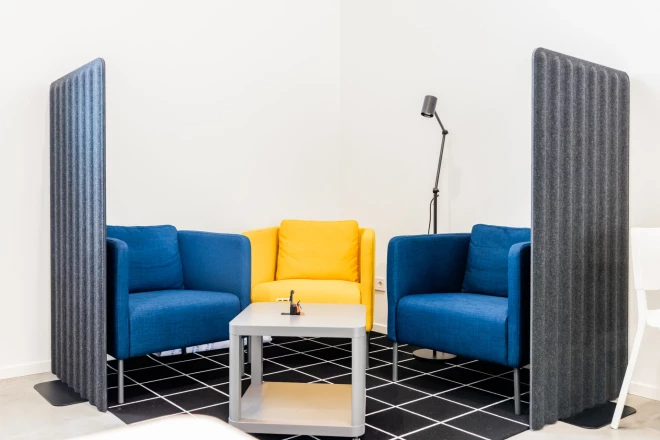 Помимо того, что переговорная комната в офисе open space расположена в полностью готовых к работе производственных помещениях, она была оборудована в контейнере. Одна из стен контейнера является сквозной и позволяет проникать естественному свету. Учитывая длинную и узкую планировку переговорной, дизайнер выбрала раздвижной белый глянцевый стол, который может легко удовлетворить потребности до восьми человек. Столешница покрыта специальной отделкой для повышения гладкости и долговечности. "В качестве дополнения к столу были выбраны современные офисные стулья бежевого и синего цветов. Эти стулья оснащены механизмами регулируемого наклона, которые подстраиваются под вес и движения пользователя, обеспечивая комфорт для всех присутствующих. Удобная посадка крайне важна в переговорной комнате, поскольку она способствует целенаправленным дискуссиям и обмену идеями. Для улучшения атмосферы переговорной комнаты была установлена стена, украшенная панелями из искусственных растений. Эти растения придают пространству живость, текстуру и цвет, имитируя все плюсы настоящих растений, но не требуя ухода", - говорит дизайнер Пуките.