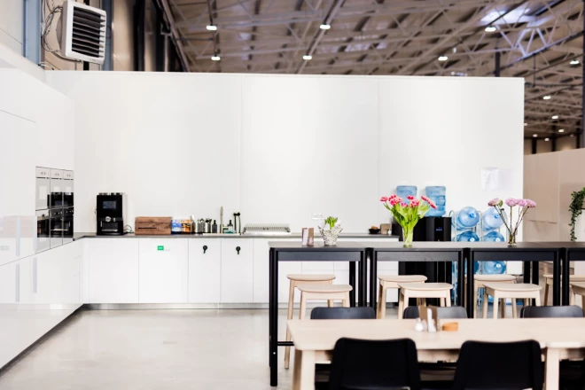 На кухне установлена кухонная система с 25-летней гарантией, спроектированная индивидуально для приспособления к самым разным потребностям. Кухонное оборудование отличается легким дизайном и глянцевым белым цветом, известным своей простотой в уходе. В углу столовой создана небольшая зона отдыха, отделенная от остального пространства отдельно стоящими звукопоглощающими перегородками. Таким образом, у сотрудников появилось личное место отдыха, где они могут расслабиться с чашкой чая и восстановить силы во время рабочего дня.