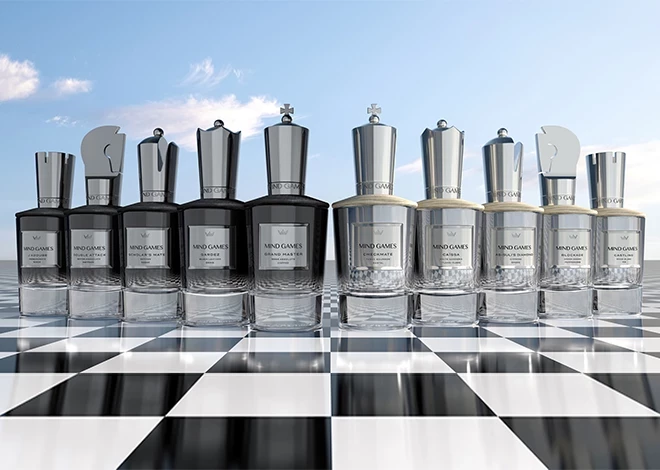 Mind Games, начавший свою историю в 2023 году, проводит несколько неожиданную параллель и связывает мастерство игры в шахматы с искусством высокой парфюмерии. Как утверждают основатели парфюмерного дома Mariana и Alex Shalbaf, логика мышления мастера-парфюмера часто бывает схожа со стратегией шахматного гроссмейстера. Перед глазами — пустая доска, набор фигур и тысячи возможных комбинаций ходов. А конечный результат зависит только от стиля игрока, опыта, глубокого понимания противника и умения просчитывать ситуацию на несколько ходов вперед.