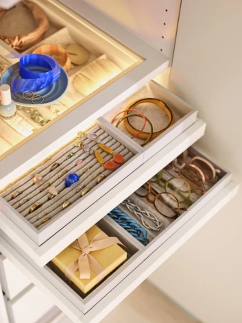 Важно подумать и что вы планируете хранить в шкафу, и выбрать подходящие внутренние аксессуары. "Вариантов много: выдвижные ящики, полки, стойки для обуви, лотки для украшений, выдвижные вешалки и многое другое - все это помогает максимально эффективно использовать пространство", - отмечает дизайнер.