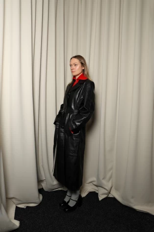 Кожаное пальто остаётся в модных рядах, но этой осенью в нём чувствуется влияние 70-х годов. Силуэт простой, но выразительный. Образ дополняют туфли в стиле Mary Jane, придающие женственную лёгкость. Актуальная деталь — носим их с носками.