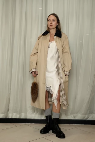 Сельская романтика воплощается и в тренче. Классический характер дополняют воротник другого тона и хит сезона — клетчатая подкладка. Важно, с чем его сочетать: в этом образе под тренчем платье в стиле ночной сорочки, а на ногах массивные сапоги, создающие кокетливый контраст. Сапоги могут быть и до колена.