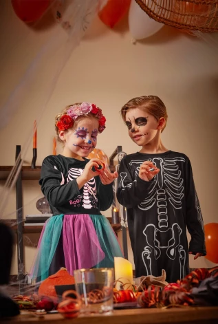 Для детей помладше можно организовать небольшую мастерскую и вместе сделать маски из бумаги, ткани и других материалов, дав волю своему воображению. Дети могут изготовить бумажные маски, а взрослые использовать немного грима, черную одежду и яркие аксессуары. Чтобы костюмы светились в темноте, используйте люминесцентные палочки или LED-аксессуары, которые придадут образу "призрачный" эффект.