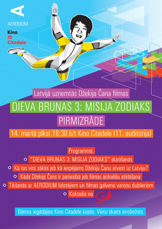 В четверг, 14 марта, в Риге пройдет премьера фильма Джеки Чана “Доспехи Бога-3: Миссия Зодиак”. Эпизоды фильма, включающие в себя полеты, снятые в Латвии в аэродинамической трубе AERODIUM, а также главных героев фильма дублируют воздушные акробаты AERODIUM. Премьера пройдет в 11-й аудитории кинотеатра “Kino Citadele”, начало в 18:30.