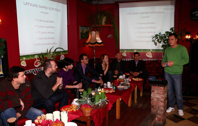 Утром 6 декабря в культурном баре «Мечты и коктейли» собрались гости, которые работают в разных сферах, но которых объединяет необходимость обмена позитивными мыслями. Они призвали всех не поддаваться ажиотажу о конце света и другим негативным эмоциям, создавая Латвийский коктейль мечты по особому рецепту: «Две части радости, три капли надежды, 15 граммов мира, взбить счастье и посыпать любовью». Позже этот эмоционально заряженный коктейль отправили в небо и хорошие пожелания пролились на Латвию.