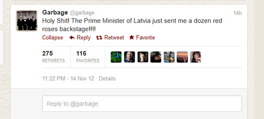 14 ноября в Риге, в концертном зале Palladium, состоялся концерт группы Garbage. После выступления солистка группы Ширли Мэнсон сделала запись в сети Twitter о том, что премьер-министр Валдис Домбровскис подарил ей охапку красных роз: «Holy Shit! The Prime Minister of Latvia just sent me a dozen red roses backstage!!!!» («О мой Бог! Премьер-министр Латвии только что прислал мне за кулисы охапку красных роз!» — свободный перевод с анг. языка)