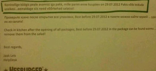 В Facebook с молниеносной скоростью распространилось внутрислужебное письмо сети быстрого питания Hesburger, в котором руководство общепита советует работникам проверять зеленый салат и удалять из него червей, выявленных Ветеринарным центром в салате «Айсберг» в ходе проверки.