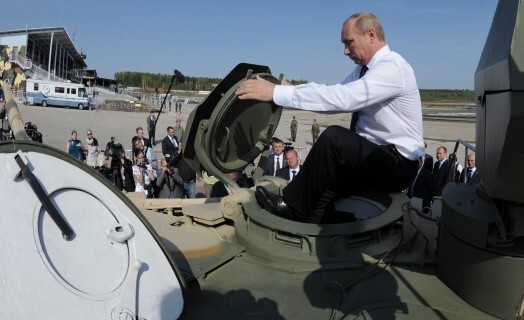 Осмотрев выставочные павильоны, Владимир Путин отправился на полигон, где в это время российские танки успешно уничтожали «вражеские БМП и живую силу противника».