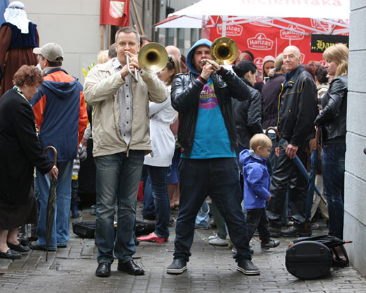 На улице Албару, недалеко от Шведских ворот, Otkrito.lv встретил Интарса Бусулиса и Вайриса Нартишса, играющих на тромбоне. Деньги, которые публика кидает музыкантам, парни себе не оставят, а отдадут на благотворительность — другим музыкантам. Тромбонисты играют вместе в первый раз, Вайрис перед этим музицировал на улице в 90-х годах — в Германии и Финляндии.