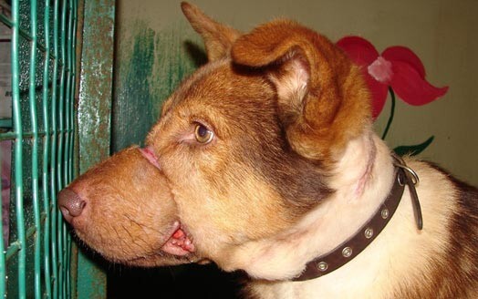 Песик, который в мучениях бродил с завязанным носом пока его не нашли, выздоровел после удачной операции и уже неделю живет в приюте на Югле.