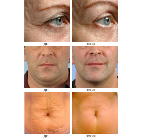 Укрепляются контуры тела, делается более упругой, подтягивается дряблая кожа живота, «опавшие» колени, кожа на руках и ногах, лечится целлюлит.