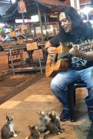 Этот мужчина поет серенады маленькой группе котят, которые без ума от музыки. Если вы слышите на улицах Пангкоры (Малайзия) музыканта, виртуозно исполняющего песни под гитару, то будьте уверены, ярые пушистые фанаты уже находятся в «зале».