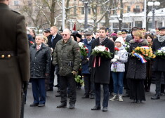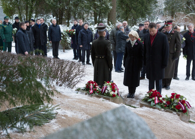Памятные мероприятия продолжились торжественной церемонией у памятника Свободы, где оркестр штаба Национальных вооруженных сил исполнил государственный гимн Латвии. Затем Вейонис, Мурниеце, министр иностранных дел Эдгар Ринкевич, другие государственные должностные лица возложили к памятнику цветы.