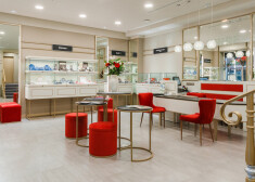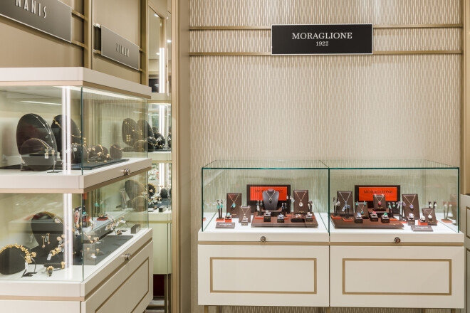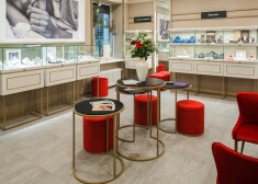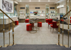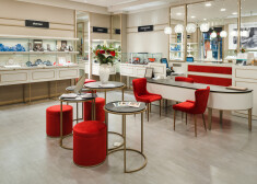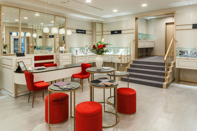 Теплая, сияющая и приятная атмосфера в интерьере вдохновлена специальным освещением, которое подчеркивает материальность и роскошь предлагаемых ювелирных изделий. Для создания воздушного визуального образа в целом, дизайн мебели салона состоит из легких металлических и стеклянных конструкций, светлых тонов и серебристо золотистых деталей.