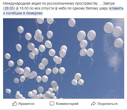Многие из нас вчера и сегодня получили сообщения в сети и на мобильный телефон о том, что сегодня в 18.00 надо выпустить в небо по одному белому шарику в память о жертвах страшной трагедии в Кемерово. Но не все с этим согласны...