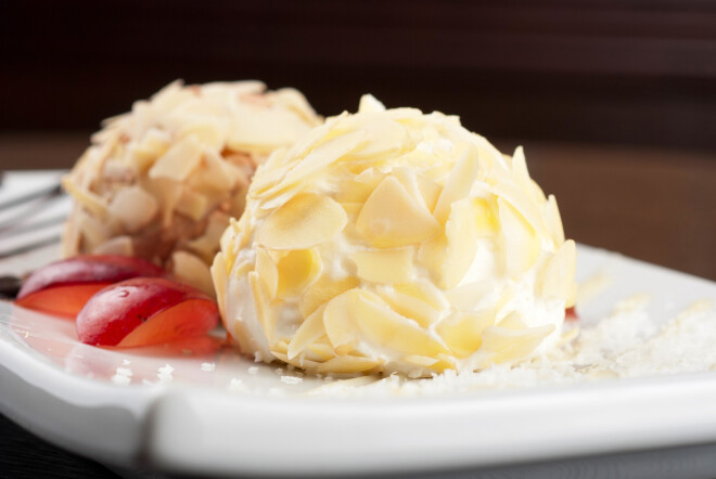 5 Выкладываем ингредиенты таким образом, чтобы наружную часть составляла творожная основа, а сердцевину — абрикосовый крем. Пасху стоит держать в холодильнике сутки и достать за полчаса до подачи. Готовое угощение украшаем фруктами, оставшимся миндалем и абрикосовым кремом.