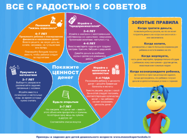 Не создавайте у ребенка обманчивое впечатление, что он должен получать деньги за все, что делает, помогая семье. Вместо этого попробуйте уделить большее внимание логическому мышлению и математике. Для более маленьких подойдут простые задания на распознавание чисел (http://mazoekspertuskola.lv/cards/view/48), более старшим детям можно дать задачи и посложнее – математические цветы (http://mazoekspertuskola.lv/cards/view/229). Об опыте модели и матери семерых детей Уны Гаваре можно прочитать здесь: http://mazoekspertuskola.lv/articles/nauda-un-berni-musdienu-mamma-una-gavare-stasta-par-savu-pieredzi