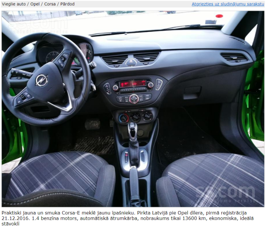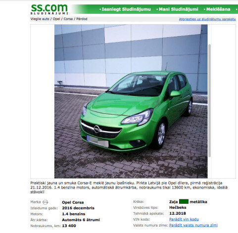 Инга думала, что это и был конец «жизни» авто, но через несколько месяцев ее удивила находка на портале объявлений ss.com. «Я смотрела раздел с машинами, внезапно увидела точно такой же Opel Corsa-E, какой был у меня, только у цвета был немного другой тон. У меня появились подозрения, и, посмотрев ближе, я поняла, что это мое авто!» — говорит Инга. Объявление было выставлено 15 марта, спустя четыре месяца после аварии, цена — 8550 евро.