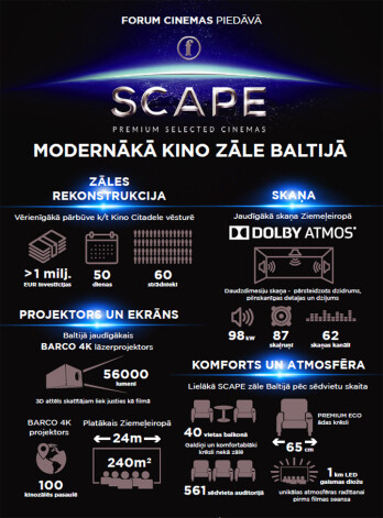 “Мы всегда предлагали нашим зрителям самые современные достижения индустрии кино – мы первыми в Латвии представили цифровую проекцию, 3Д технологии, звук 7.1, кафе самообслуживания и самую большую видео-стену. На этот раз мы позаботились о создании самого современного в Прибалтике кинозала SCAPE в Риге. Новейший кинозал предоставит посетителям опыт мирового уровня и небывалое в Латвии ощущение кино,” рассказал Нормундс Лабренцис руководитель “Forum Cinemas”.