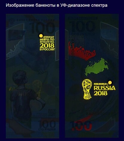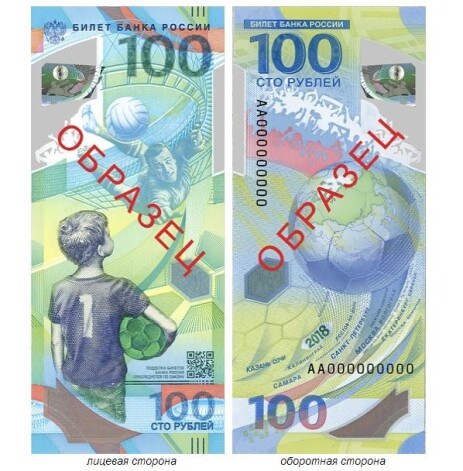На представленной банкноте с лицевой стороны изображены легендарный вратарь Лев Яшин и мальчик, мечтающий повторить его достижения, как символ преемственности поколений. На оборотной — футбольный мяч, символизирующий земной шар, на котором выделяется карта России. Ниже — названия городов, в которых пройдут матчи мундиаля.