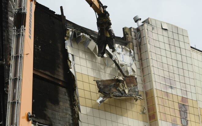 В Кемерове крупногабаритная специализированная техника приступила к сносу сгоревшего в конце марта торгового центра "Зимняя вишня".