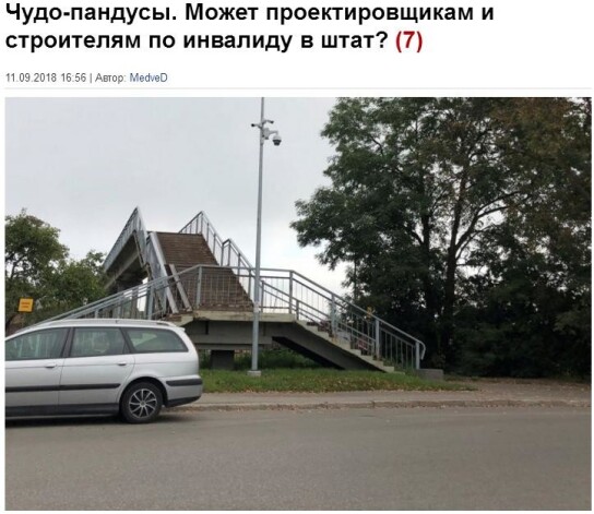 Житель Даугавпилса рассуждает о странных пандусах, которые не помогают инвалидам. Он вопрошает: "Может, проектировщикам и строителям по инвалиду в штат?".