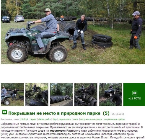 Забрызганные грязью люди в толстых рабочих рукавицах вытаскивают из топи тяжелые, заросшие травой и деревьями автомобильные покрышки. Привязывают их за квадроциклами и тащат до ближайшей прогалины. В природном парке у Папского озера на территории Руцавского края работники Управления охраны природы (УОП) уже на втором субботнике пытаются освободить биотоп от нехорошего наследия советской армии – неизвестного количества покрышек, которые лежать здесь в воде уже более 20 лет. Понадобится еще и третий субботник, – считают они, как сообщает портал liepajniekiem.lv.